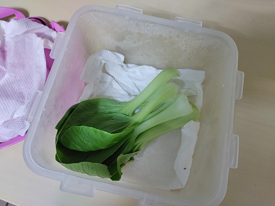 위와 같이 청경채를 용기에 넣어 밀폐를 해놓으면 중간중간 공간이 있어 줄기나 잎에 있는 물기가 흘러 바닥에 있는 키친타월로 흡수가 되는 거예요. (상추와 같은 쌈채소도 이렇게 보관하면 무르지 않고 기본 보관기간 이상 보관이 가능해 오랫동안 신선하게 먹을 수 있습니다.)