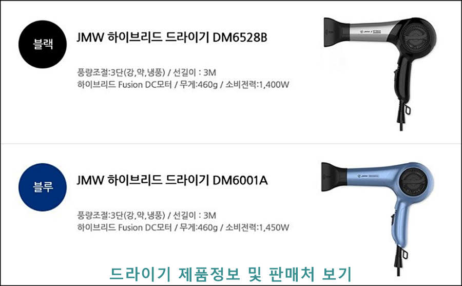 추가로 jmw 하이브리드 드라이기(dm6001 a)는 편리하고 평범한 사용성외 제품 자체에 과열을 1차, 2차 차단을 해주는 이중 안전장치인 바이메탈로 조금 긴 시간 사용 시에도 모터 과열로 인한 위험을 방지해주고, 드라이기 선 꺾임이나 꼬임을 방지해주는 연질 코드, 하이브리드 Fusion 모터로 두 개의 드라이기로 말리는 것 같은 성능으로 머리 말리는 시간 단축 등 기술적인 장점들도 가지고 있는 드라이기입니다.