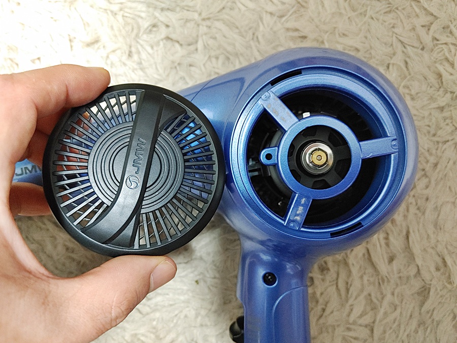 이 드라이기의 특징 중 하나인 흡입구인데 흡입구 망을 시계 반대방향으로 돌리면 이미지처럼 탈착이 가능해 드라이기 모터 부분에 쌓이는 작은 먼지 등을 제거하기 좋아 먼지로 인한 모터 과열도 방지하고 위생적으로 사용할 수 있다는 장점이 있네요 (1년 넘게 사용하고 있지만 크게 먼지는 많이 쌓이지 않더군요)