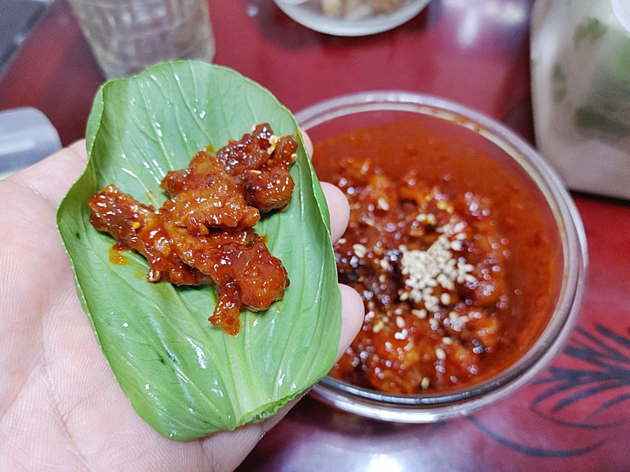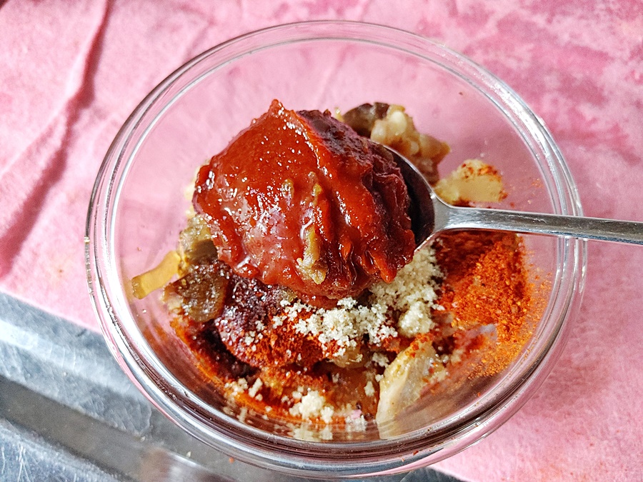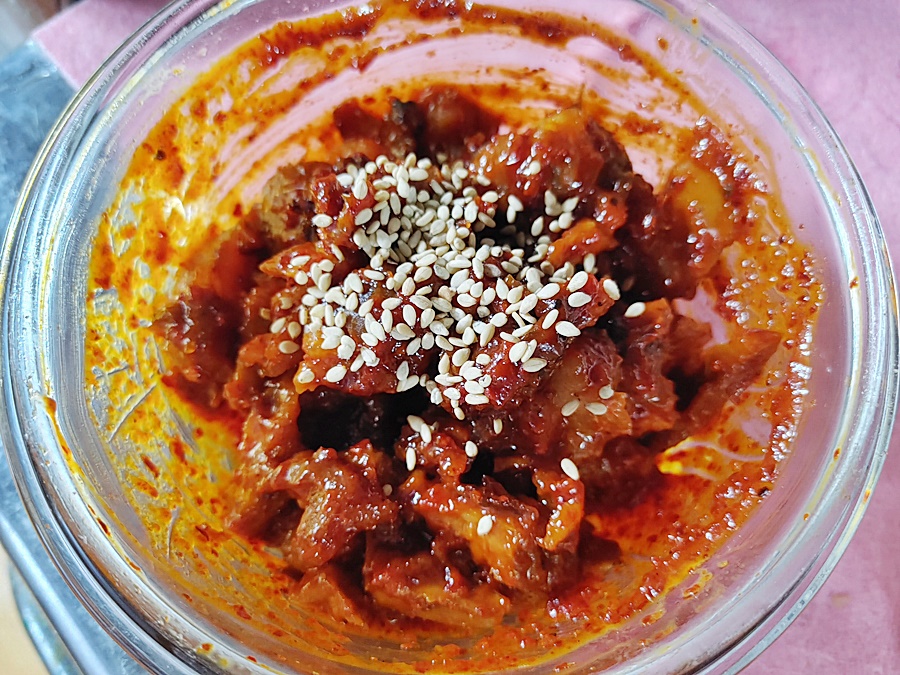 뼈에서 발라낸 족발 살코기에 고추장 + 고춧가루 + 다진 마늘(전 없어서 패스) + 설탕 + 간장을 넣고 마지막에 참기름 살짝 추가... 역시 다진 마늘이 아쉽네요. 양념 맛의 차이가 다진 마늘이 들어가냐 안 들어가냐도 많이 나는 게 좀 아쉽지만 그래도 그리 나쁘지 않기에 일단 다음 장보기를 기약하고..... 다진 마늘 사야지.. 다진 마늘 사야지...