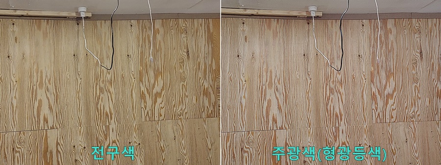 자 그럼 전구색 형광등과 주광색(형광 등색) 형광등을 한 번 비교를 해볼까요
