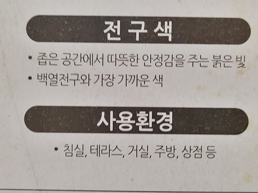 앞에 전구색 이미지 설명처럼 전구색은 백열전구에 가까워 좁은 공간에서 안정감을 주는 빛으로 사용할 때 선택하면 되겠고 일반적으로는 주광색 형광등을 사용하면 되기에 형광등 교체 시 참고하시면 되겠죠