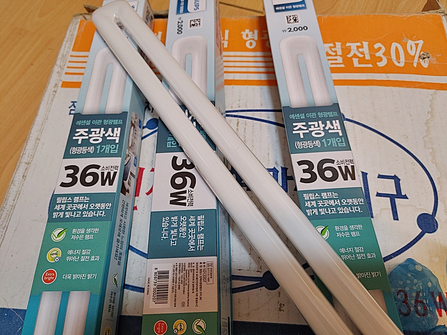 사무실 겸으로 생활하는 집에 일체형 형광등이 나가서 등을 교체하려고 하는데 처음엔 수명도 밝기도 전력 소비도 괜찮은 일체형 led 형광등으로 교체를 하려다 기존에 있던 형광등만 끼워 쓰면 되는 등기구가 있어 형광등만 구입하여 끼우기로 했어요 먼저 등기구에 맞는 전력을 확인하는 게 기본이겠죠 사용할 등기구에 맞는 형광등 전력이 36W로 일반 가정에서 많이들 쓰는 형광등 전력이네요