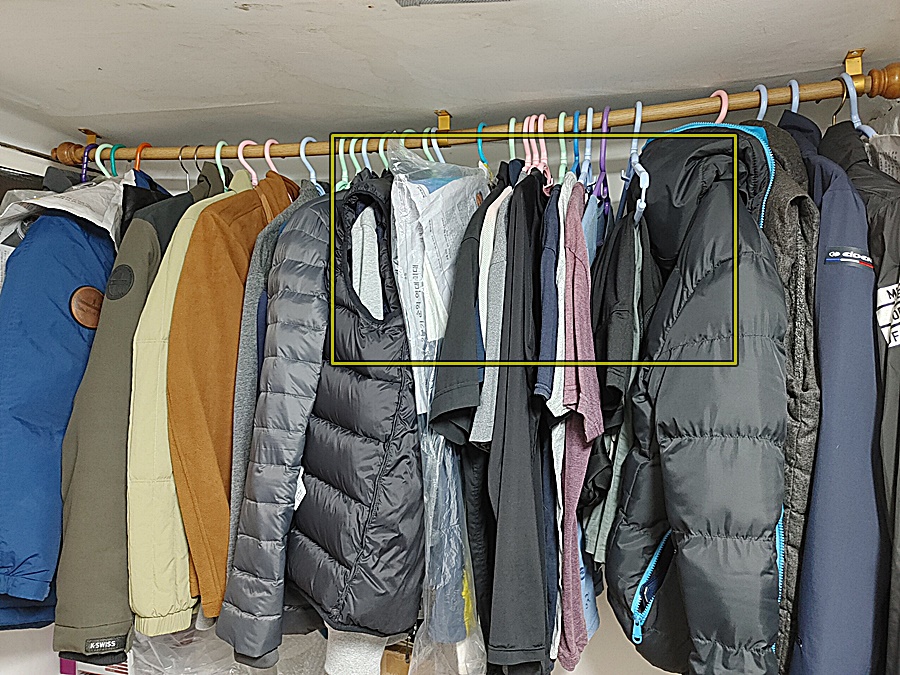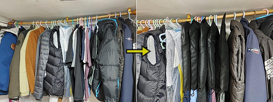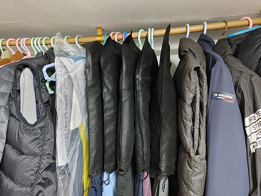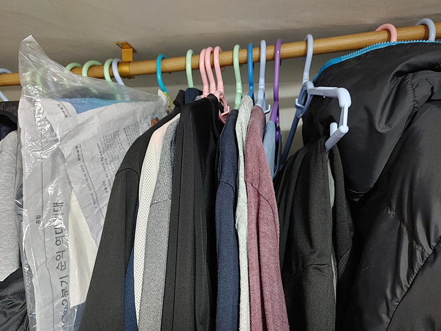 그래도 나름 구김이 적은 옷들은 따로 가방 등에 보관을 하면 되는데 구김이 많은 옷들은 그냥 계절에 따라 위치만 옮겨 가며 옷걸이에 걸어 정리를 하는 정도로 옷 정리를 하고 있네요