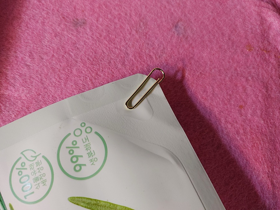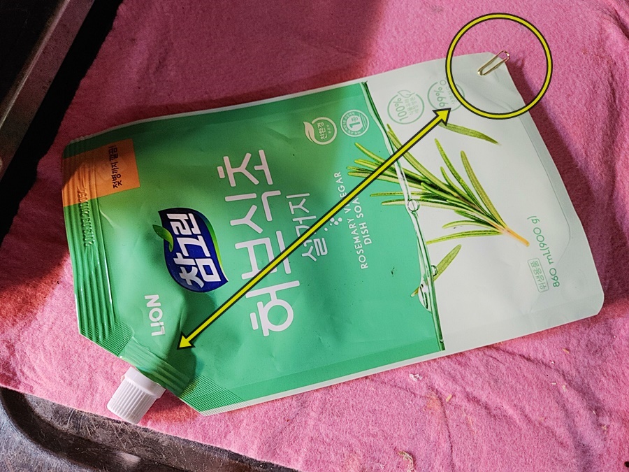그리고 준비한 클립을 리필용 주방세제 포장지 바닥 끝쪽에 위와 같이 클립 끝이 조금 남도록 끼워주고요