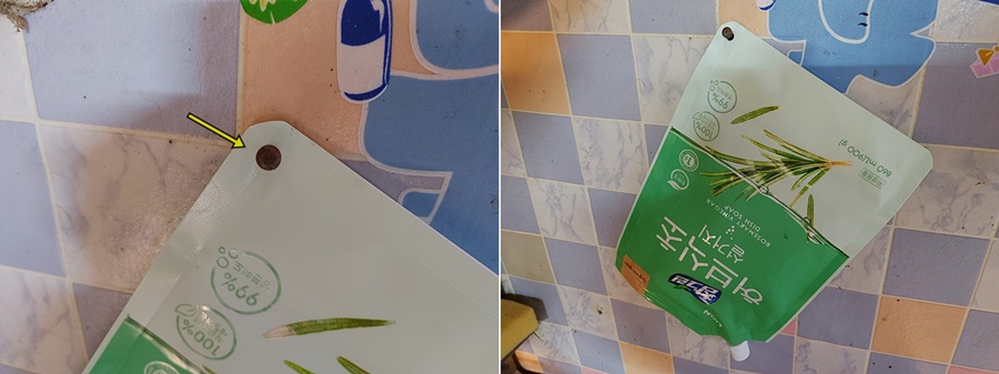 이렇게 걸어 놓으면 포장용기가 살짝 비스듬히 기울어지게 되는데요