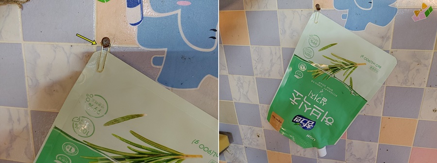 위 이미지처럼 리필용 주방세제에 끼운 클립을 걸 수 있는 적당한 곳에 고리를 만들어 걸어만 주면 됩니다.