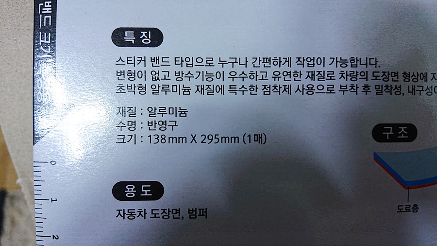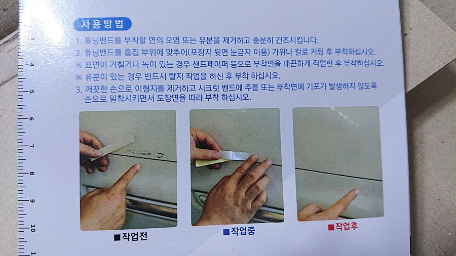 사용방법도 특별한 기술이 필요없이 차량의 흠집난(자동차 도장면, 범퍼등) 부분의 면적 크기만큼 튜닝밴드를 재단하여 붙여주기만 하면되기에 여성운전자 분들도 쉽게 작업이 가능한 제품입니다.