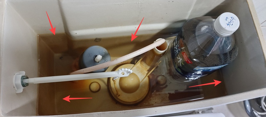 이사를 하고 욕실 청소를 하면서 습관처럼 변기 물을 아껴 쓰기 위해 물을 채운 페트병을 넣으려고 변기 물통을 확인하는 순간 오랫동안 쌓이고 쌓인 물때가 심각한 수준입니다.