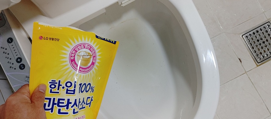 이번엔 과탄산소다를 물을 내리고 남은 양변기 물에 솔솔솔 뿌려주고 휴지를.. 음??