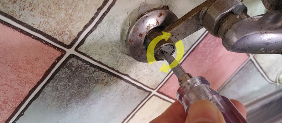 우선 낡은 싱크대 수전 분리를 하기 전 계량기로 달려가?????? 지 마시고 수전과 연결된 벽 쪽을 보시면 앞에서 보셨던 일자 모양 홈이 있는데 이곳을 일자 드라이버를 이용하여 수도를 잠그고 열고를 할 수 있답니다.