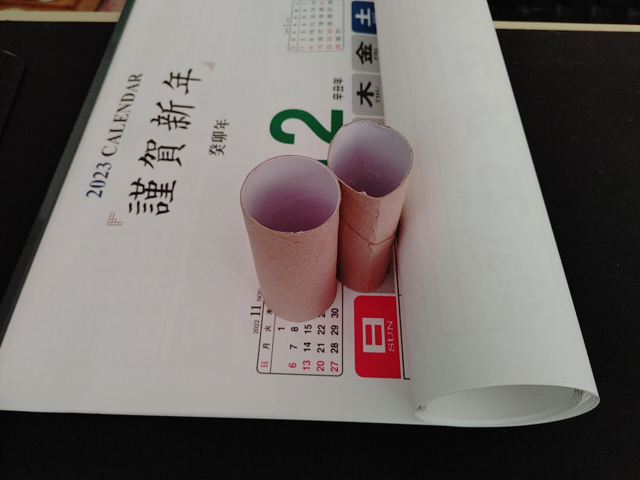처음 말린 달력을 펼쳐서 준비한 휴지심이 들어갈 수 있도록 말린 달력을 반대로 돌돌 말아서 휴지심을 쏙~~~~