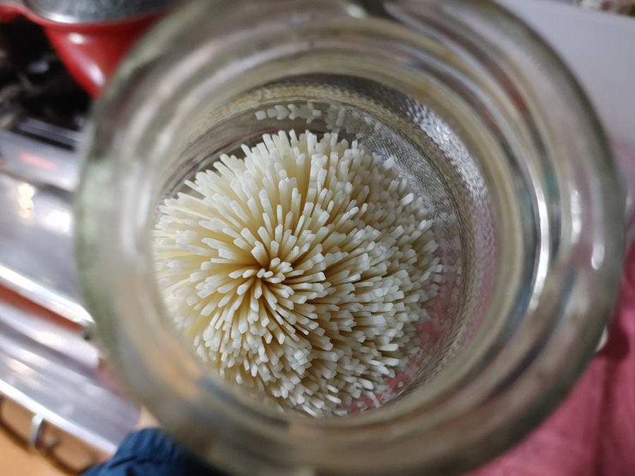 살살살 흔들어가면서 넣어주니 국수가 병 안쪽 빈자리를 찾아 자리를 잡습니다.
