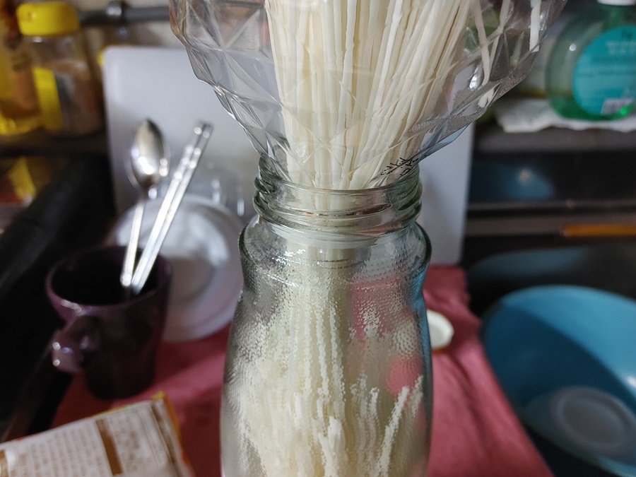 병 안에 국수가 어느 정도 채워지면서 더 이상 국수를 넣기에 역부족....
