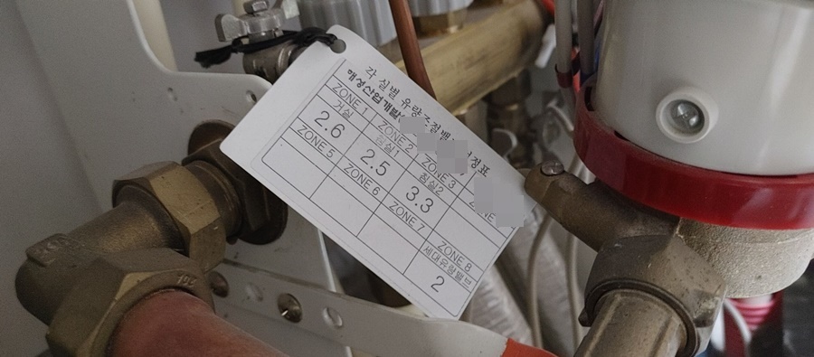 일단 새라새는 작은 방을 확인하여야 하기에 집 구조에 맞춰 설정되어 있는 조절밸브의 적정 설정표를 확인하여 조정밸브가 맞게 설정되어 있는지 확인했더니 아마 이전 거주자님이 잘 사용하지 않았던지 난방비를 줄이고자 작은 방 유량밸브가 기준치보다 낮게 되어있어 적정설정표에 맞게 조정을 해주었네요.