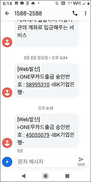 띵~~~ 동 하면서 문자로 출금을 위한 승인번호 문자가 전송됩니다.