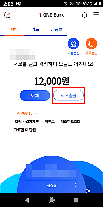 메인화면 현재 계좌 잔액이 나오고 그 밑에 이체와 atm출금이 있어요