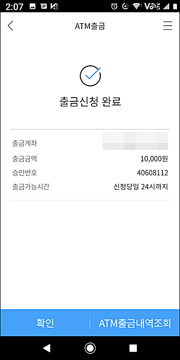 위와 같이 atm출금신청 완료 화면이 나오면