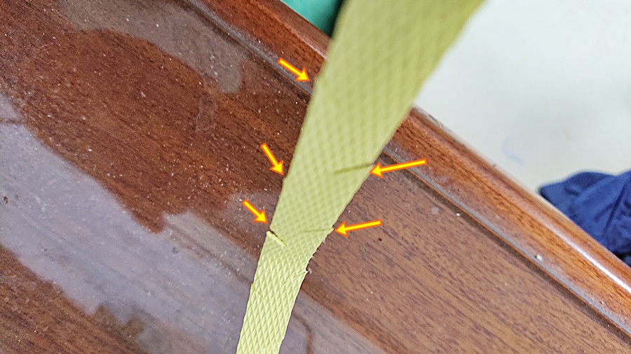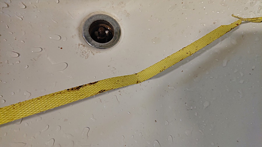 밴딩끈 끝부분을 위 이미지와 같이 뾰족하게 잘라주는데 이는 밴딩 끈을 세면대에 넣을 때 걸림을 최소화하면서 최대한 깊이 넣기 위함입니다.