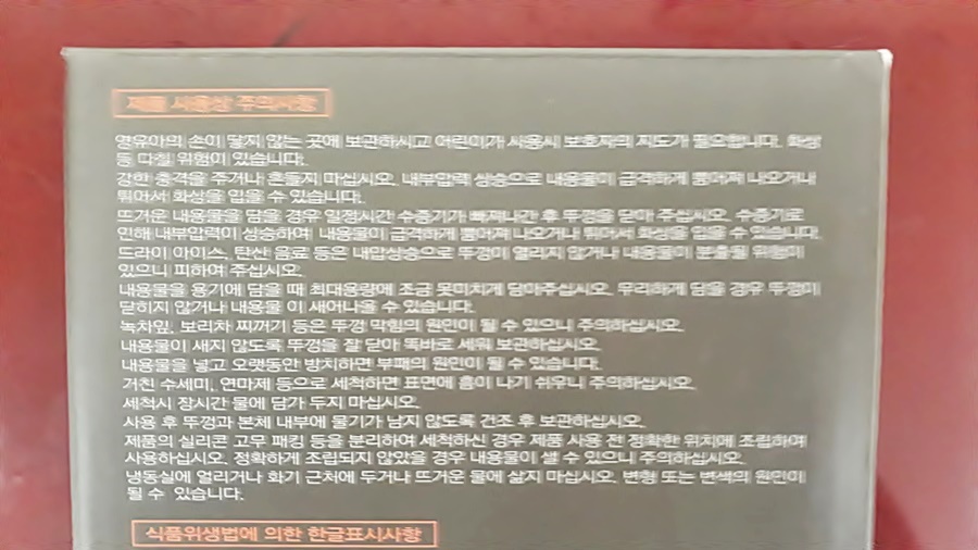 음.... 딱히... 앞에서 말했듯 입구가 손이 들어가지 않아 도구로 세척한다는 점 말고는 다른 물병들 후기들을 보면서 비교하였을 때 가정용 보온, 보냉용 물병으로 괜찮다고 생각하면서 앞으로 오래오래 사용하려고요^^