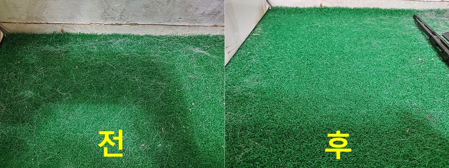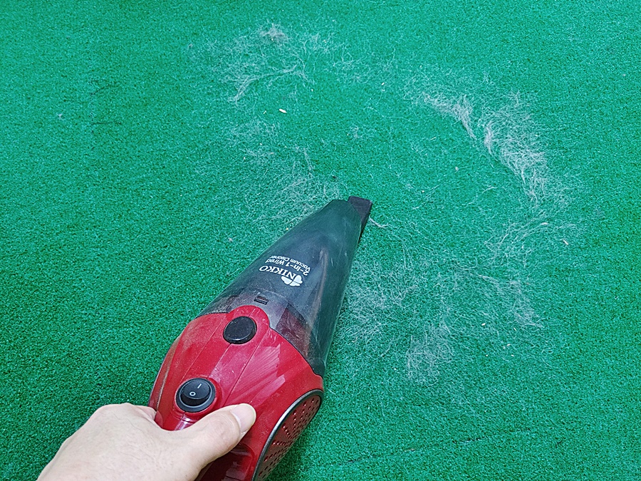 PP와 같은 플라스틱 재질의 인조잔디이기에 그냥 쓸어서는 털제거에 어려움이 있답니다.