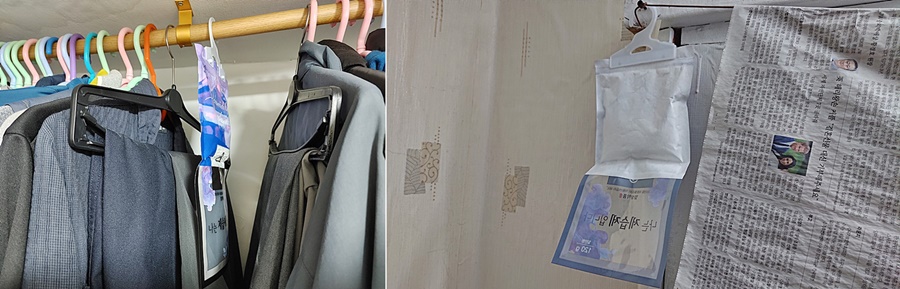 작은방 옷걸이에 걸어 둔 제습제의 모습입니다.